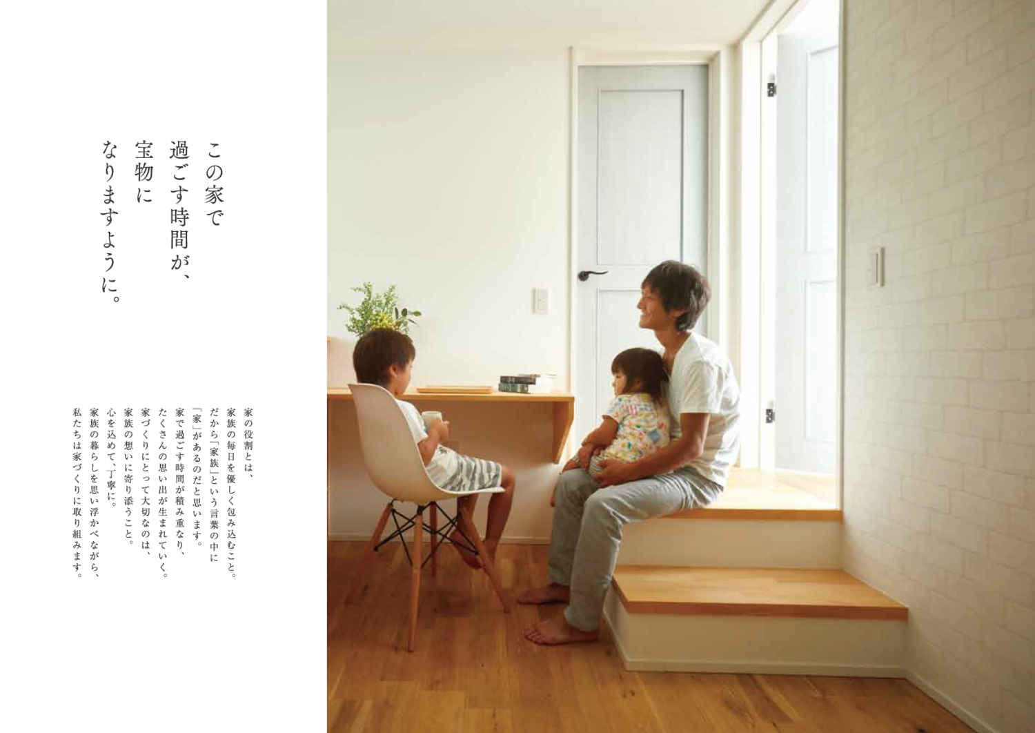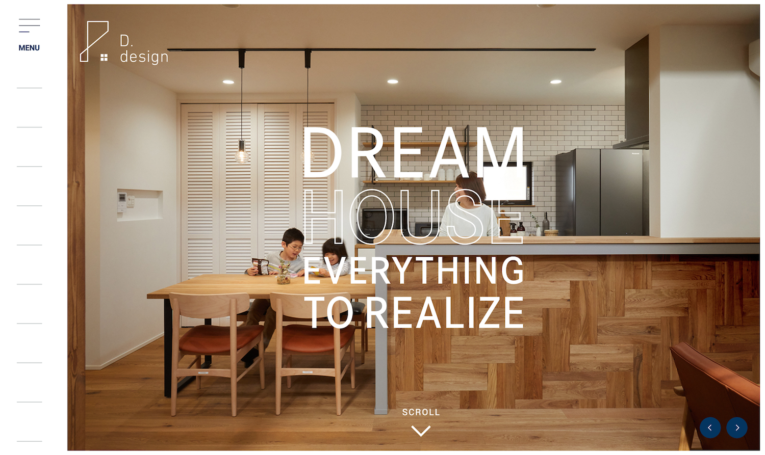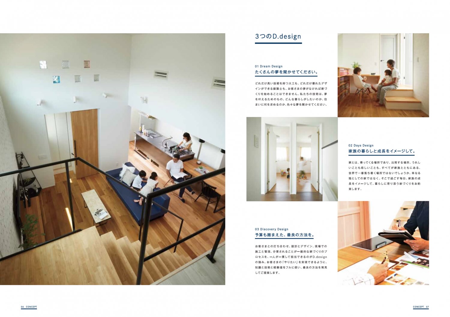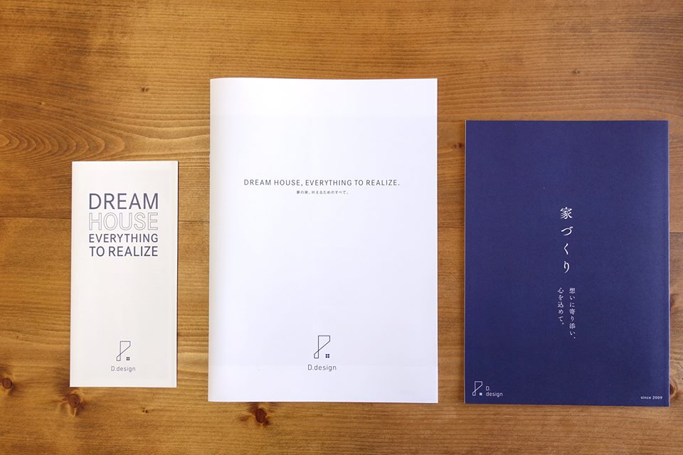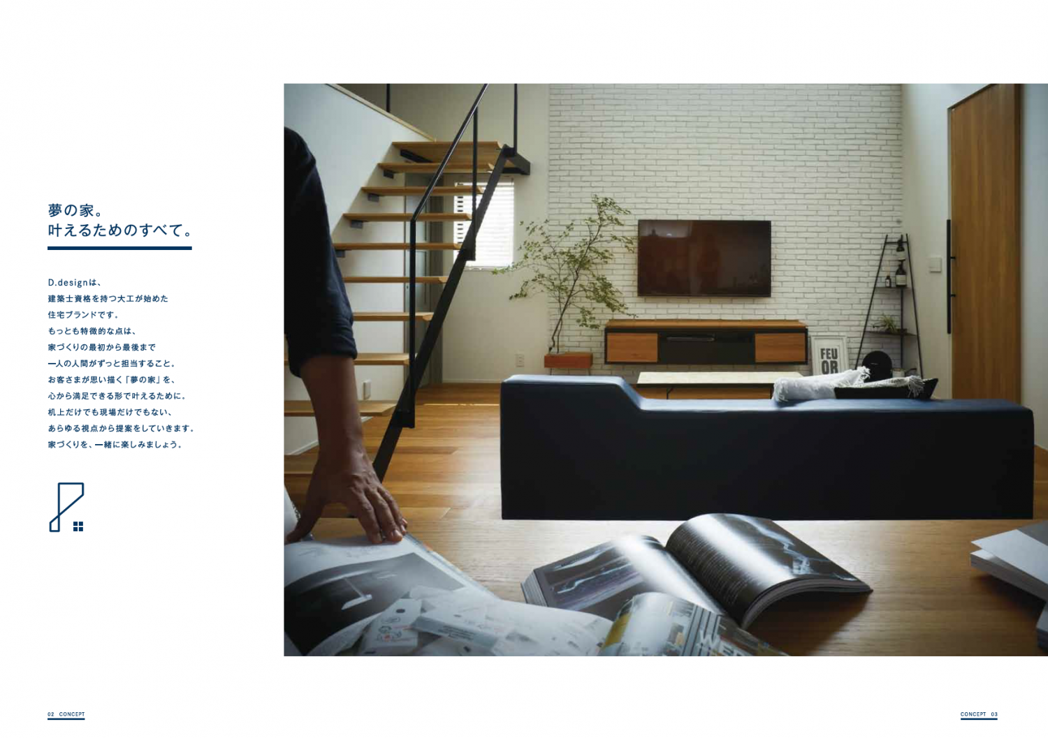 D.designは、大工として豊富な経験を持つ代表の眞島さんが、建築士資格を取得して立ち上げたブランド。ヒアリングから設計・プランニング、施工、引き渡しまで、家づくりのまさに最初から最後まで安心して任せられることが特徴です。 「夢(Dream)を形にする(design)=D.design」という思いを込めて作られたブランド名。そこに「Days design(日々を形作るデザイン)」「Discovery design(発見するデザイン)」の二つの価値をプラスして、よりD.designの個性を強くメッセージすることをめざしました。