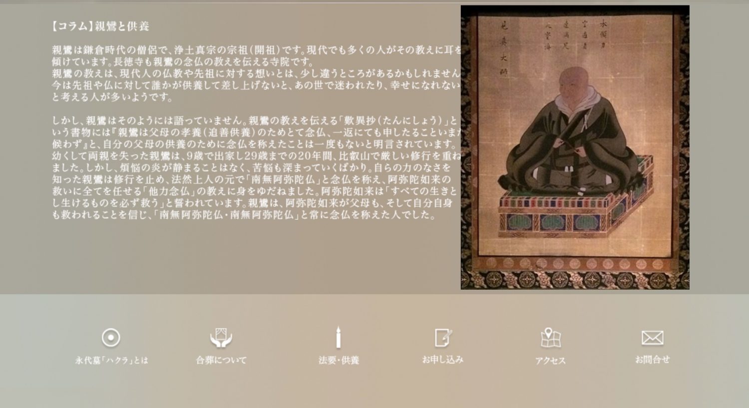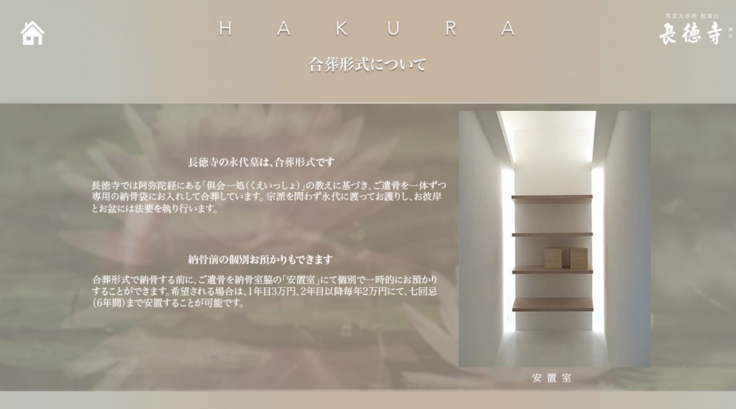 新潟県新発田市にある長徳寺の永代墓「ハクラ」のWEBサイト用のコピーを制作しました。ハクラは安置室と祭壇を組み合わせた設計で、単なるモニュメントとしてのお墓というだけでなく、同じ建物内でしばし故人をしのぶ時間を過ごせるような構造になっています。「倶会一処(くえいっしょ)」という仏教の教えをもとに、生者と死者をつなぐ場としてのハクラのあり方に焦点を当ててコピー化しました。