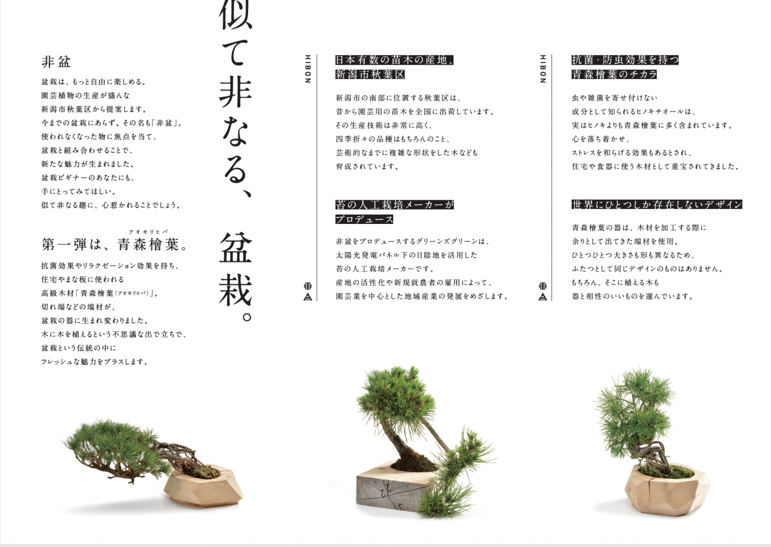 「似て非なる、盆栽。」をコンセプトに、使われなくなった物と盆栽を組み合わせて、新たな価値と魅力を生み出そうとする実験的なプロジェクト。第一弾は青森檜葉(ヒバ)の端材を器に使うことで、木に木を植えるという不思議な出で立ちになっています。