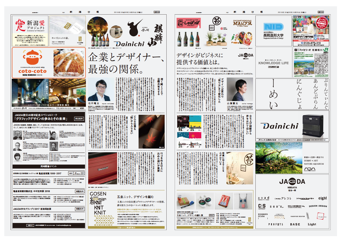 「JAGDA in NIIGATA 2018」広告特集のライティングを担当。メイン特集となる「企業とデザイナー、最強の関係。」では、Pデザイン研究所の山賀慶太さんと株式会社フレームの石川竜太さんに取材をして、デザインが世に出るまでのプロセスについて深く掘り下げました。お二人とはもともと知り合いでしたが、自身のお仕事について詳しく語ってもらう機会は初めてでした。