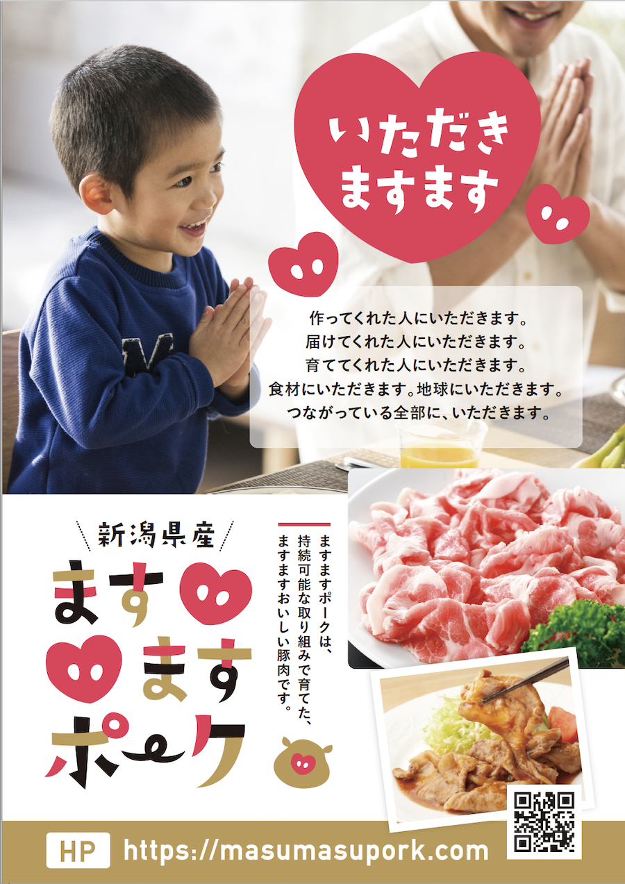 ネーミングは『ますますポーク』。「いただきますます」と「ますます良いおいしさへ」というふたつの思いを込めました。食物と環境への感謝と、それらを将来につないでいく意志を表現しています。