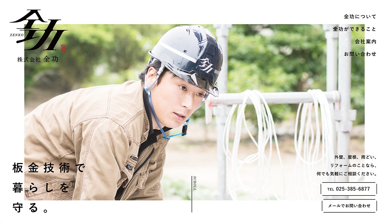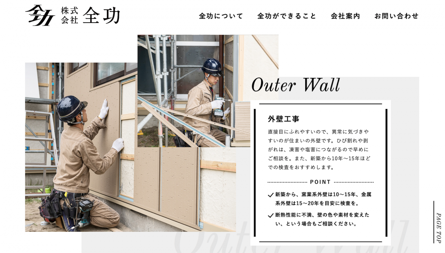 「全功」という会社名は、渡邊さんの名前の「功太」から一字もらい、「全ての仕事に全ての技術と力を注ぎ、全ての仕事を成功させる」という意思を込めました。漢字の中に隠れている「全力」は、ロゴデザインにも活かされました。コンセプトコピーでは、板金の存在と役割、そしてその価値を伝えるとともに、全功の仕事に対する姿勢と使命感を表現しました。WEBサイトでは、事務的になりがちなサービス紹介に「ポイント」という項目を設け、全功の強みが一般の方にも分かりやすく伝わるよう心がけました。